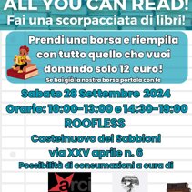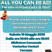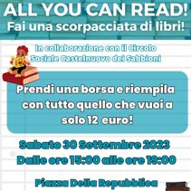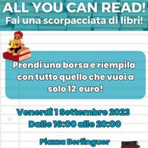 Nuova formula dei nostri eventi in Piazza. ALL YOU CAN READ, quando le scorpacciate non fanno male. Vieni a trovarci in piazza, prendi una delle nostre borse per 12€, riempila con quanti libri puoi e portateli a casa. Per continuare a dar vita ai libri usati